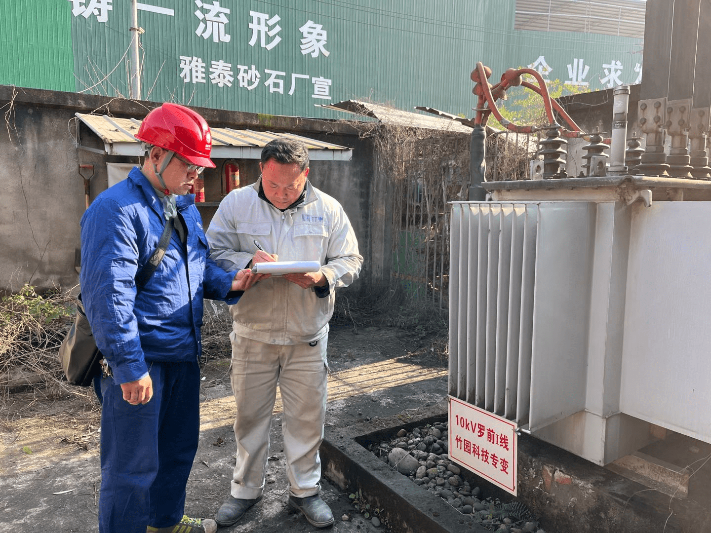 “史师傅,请把变压器四周的杂草清理下,这是非常危险的隐患。”用电检查员李继严肃说道。在旧配电房处,检查员发现该公司旧变压器周围杂草丛生,几乎快要接近变压器主体,一旦引起短路,不仅影响该公司的生产,还会对电网的安全运行造成威胁。经过仔细排查,用电检查员共发现竹元科技存在两处用电隐患,并将发现的问题进行详细记录,能处理的立即处理,不能处理的下发整改通知书,督促整改,保障该公司复工复产用电安全。